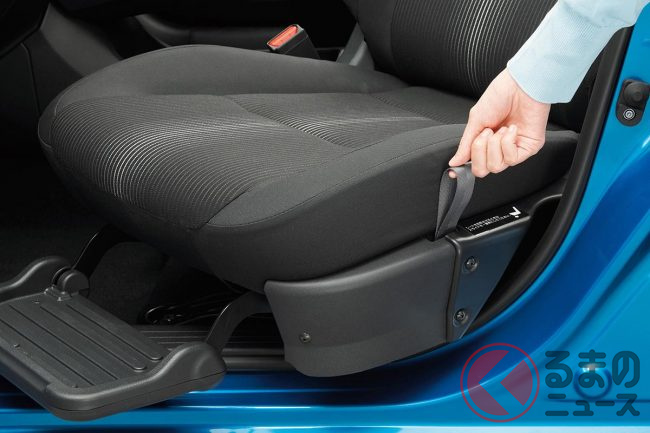 新型ノート 助手席回転シートは、簡単な手動操作で、助手席を車外に向けて回転できるモデルです。スカートや和服を着ていても足を揃えてスマートに乗り降りすることが可能になります。