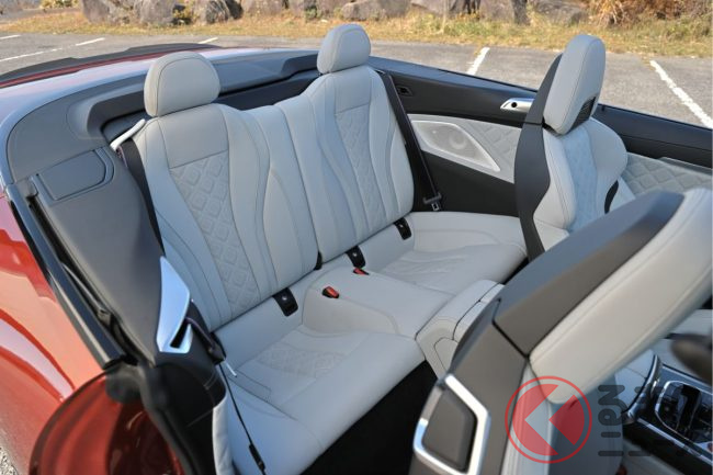 後席に乗り込むときにイージーなのは、幌を開けてしまうことだ。スイッチを押してから14秒で完全に開けることができるし、同じく14秒で閉めることもできる。これは市街地程度のスピードならば走行中でも可能だ。またクルマの外からリモートコントロール(キー)を使ってルーフ開閉もできる。