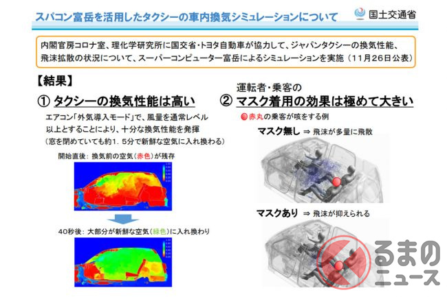 なお、国土交通省の自動車局安全政策課は、全国の「全国ハイヤー・タクシー連合会」と「全国個人タクシー協会」に対して、タクシーの車内における換気性能や飛沫拡散の状況についてシミュレーション結果を通達しています。