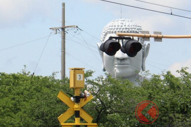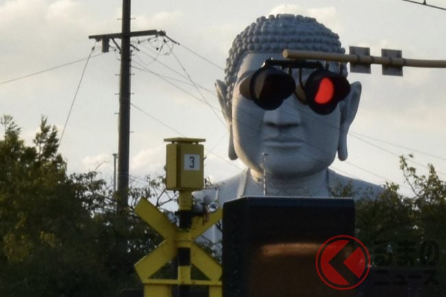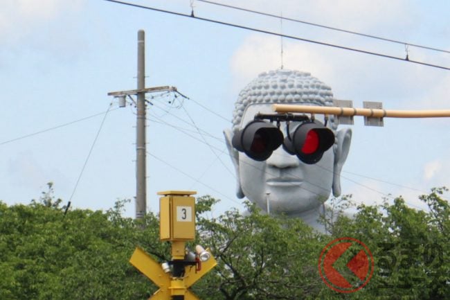 しかし、写真をよく見てみると、サングラスの正体は踏切信号。大仏に踏切信号が上手く重なることで、大仏がサングラスをかけているように見えているのです。