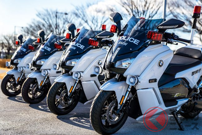 今回、先導車に使われていたBMWの『C evolution(シー・エヴォリューション)』は白バイとして使ってもおかしくない大柄なボディを持つ650ccスクーターの車両をベースに電動化したもので、大容量リチウムイオン電池を搭載し航続距離は160km。2020年2月から警視庁で正規採用されています。