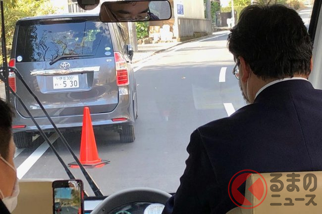 路上駐車車両の少し手前で、コントロールセンターからの指示により、いずきゅん号の運転手はハザードランプを点滅して停止した後、「遠隔運転を明確化するため、降車します」と車外に出ました。
