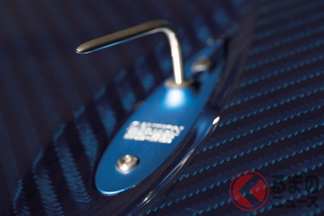 さらに、サイドからリアのライトにかけて「強烈なエアロダイナミクス」をイメージした伸びやかなトリコロールのラインが、ブルーカーボンのボディに描かれている。