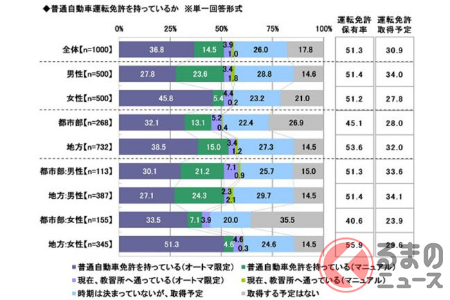 まず始めに、普通自動車運転免許を持っているかを聞いたところ、「普通自動車免許を持っている(AT限定)」は36.8%、「普通自動車免許を持っている(MT)」は14.5%で、合計した運転免許保有率は51.3%でした。