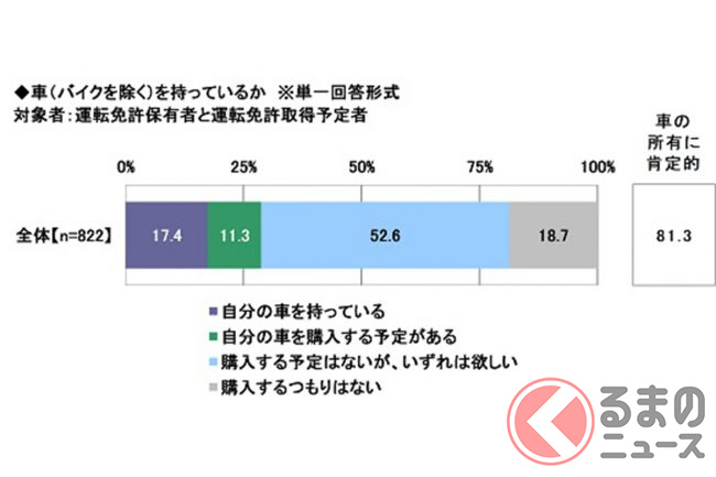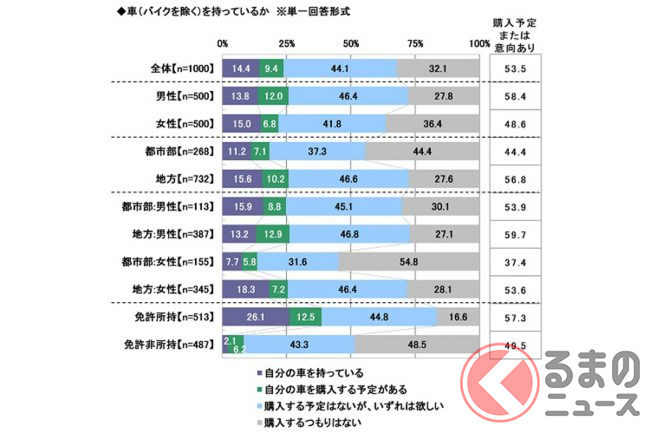 次に、全回答者を対象に、クルマ(バイクを除く)を持っているかを聞いたところ、「自分のクルマを持っている」は14.4%、「自分のクルマを購入する予定がある」は9.4%、「購入する予定はないが、いずれは欲しい」が44.1%と、合計した購入予定または意向ありは53.5%との結果です。