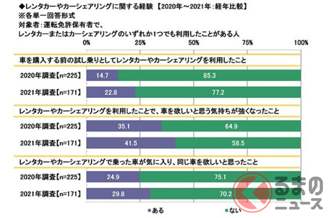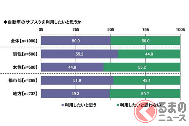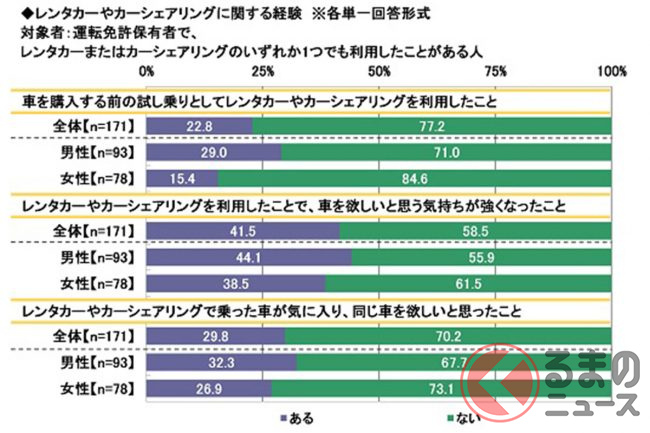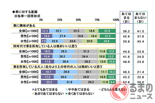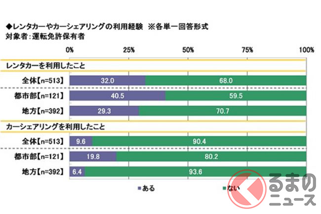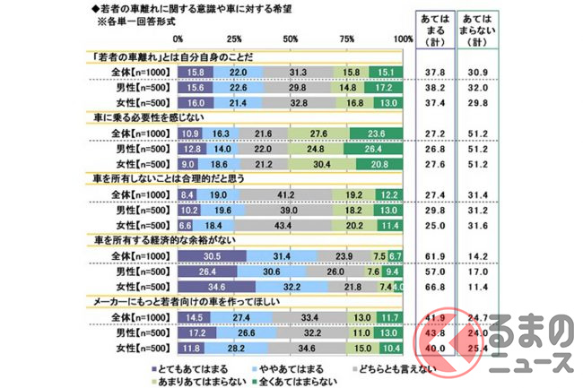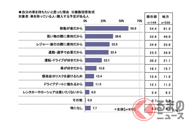さらに、マイカー所有率(「自分のクルマを持っている」の割合)を男女・居住地別にみると、男性では都市部は15.9%、地方は13.2%と、都市部のほうがやや高くなったのに対し、女性では都市部が7.7%、地方が18.3%と、地方のほうが高い結果となっています。