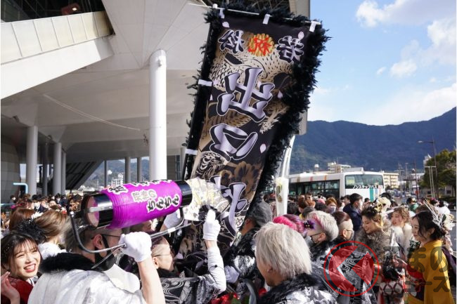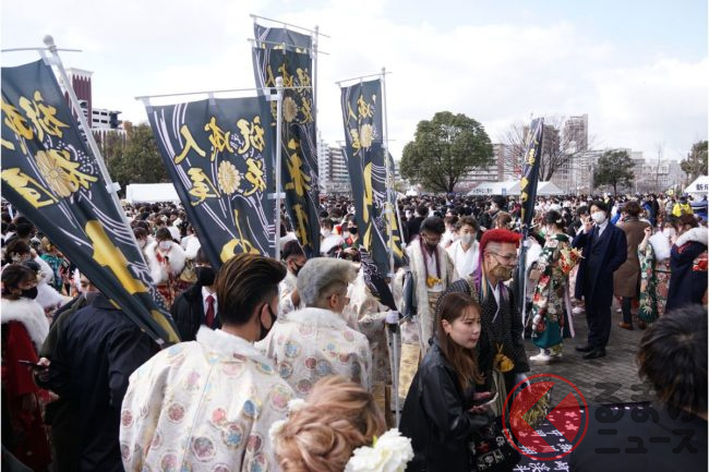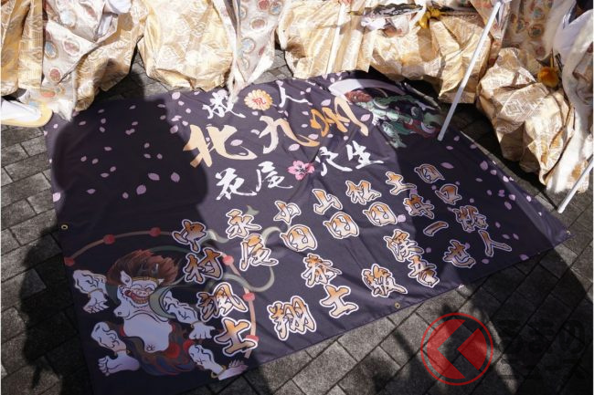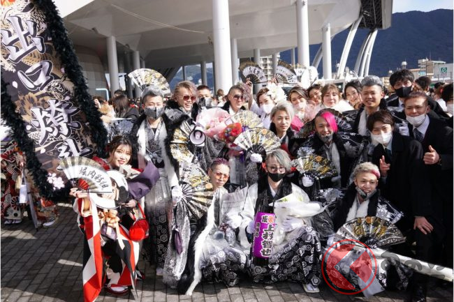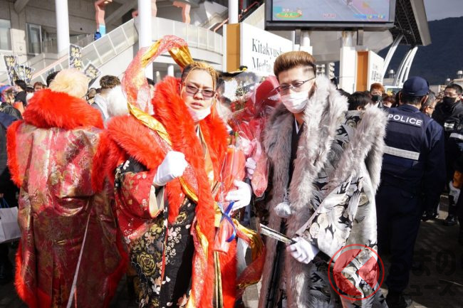 北九州市の成人式は、その度肝を抜く派手な衣装や友人グループで作成した個人名入りの大きな旗や、のぼり、扇子や提灯など、とにかく派手な演出でおなじみです。