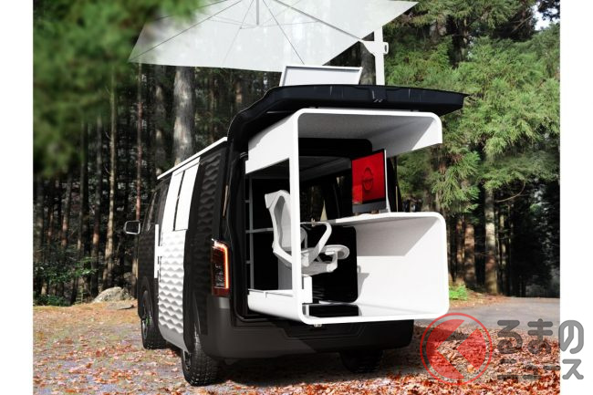 インテリアは、都会ではオフィスを車内に格納してプライベートで安全な空間、自然のなかではオフィスをバックゲートから引き出して広々とした開放的な空間を演出します。