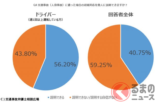まず、「交通事故に遭った場合の初期対応を他人に説明できますか?」との質問には、回答者全体の59.25%の人が「説明できない/説明する自信がない」を選択。この質問の回答者のうち「週1回以上運転しているドライバー」に対象を限定すると「説明できる」と回答した人は、回答者全体と比べ15ポイント程度の増加となる56.2%で、残りの43.8%は「説明できない/説明する自信がない」を選んでおり、ドライバーの5人に2人以上は、交通事故への初期対応を正しく理解しないまま運転していることがわかる結果となっています。