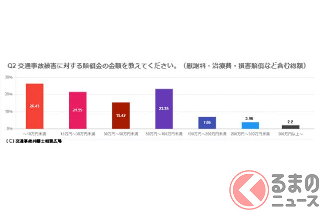 交通事故被害に対して受け取った賠償金の金額(慰謝料・治療費・損害賠償など含む総額)の割合は、以下の通りです。