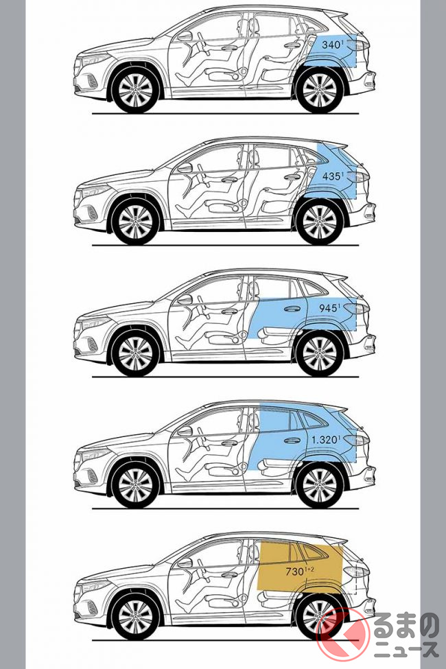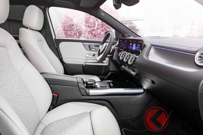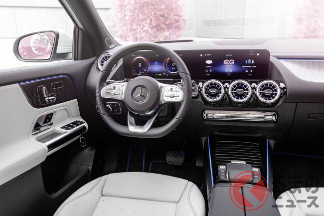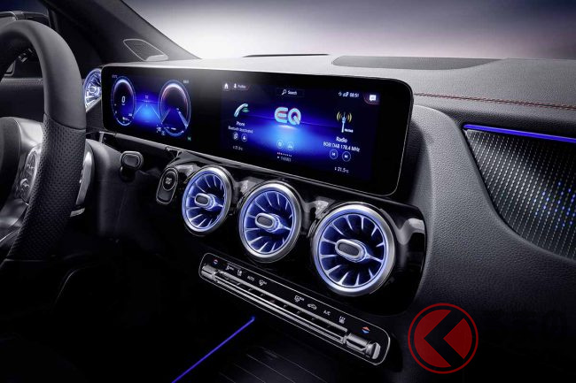 フルLEDヘッドライト内にはブルーのカラーハイライトが入り、EQモデルを強調している。またインテリアは、7インチ、または10.25インチを2台搭載したワイドスクリーンが目をひく。