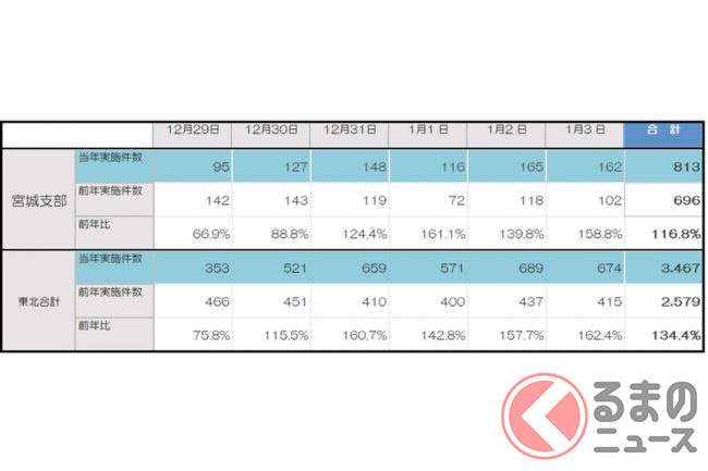 そのほか、JAFの宮城支部は2020年12月29日から2021年1月3日までの年末年始6日間の、管内におけるJAFロードサービス実施件数を発表。