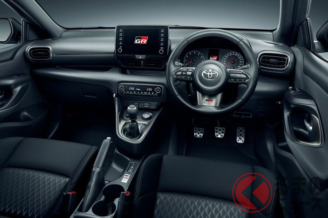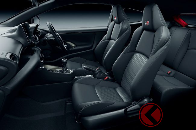 ボディはヤリスと同様なシルエットながら3ドアハッチバックのみとされ、前後フェンダーは迫力ある外観を演出するオーバーフェンダーを採用。新製法のカーボン製ルーフを採用し、ボンネットとドアパネルにはアルミ素材を用いるなど、軽量化もぬかりありません。
