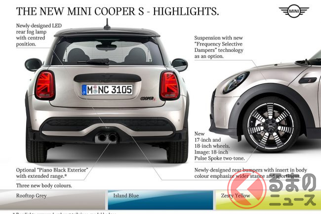 ボディカラーは3色の新色が追加されている。ルーフトップグレーメタリックとアイランドブルーメタリックに加え、これまではMINIコンバーチブルのみでの設定だったゼスティイエローも用意された。