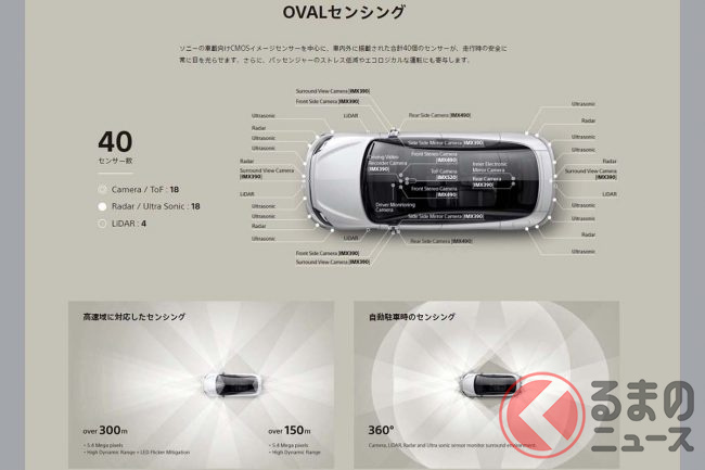 その開発の目的は、ソニーがモビリティ分野における新たな取り組みを内外に広く知らしめること。そのためにソニーが得意とする車載向けCMOSイメージセンサーやToFセンサーなど各種センサーを計33個搭載し、将来的にはレベル3からレベル4の自動運転も視野に入れて開発されているという。