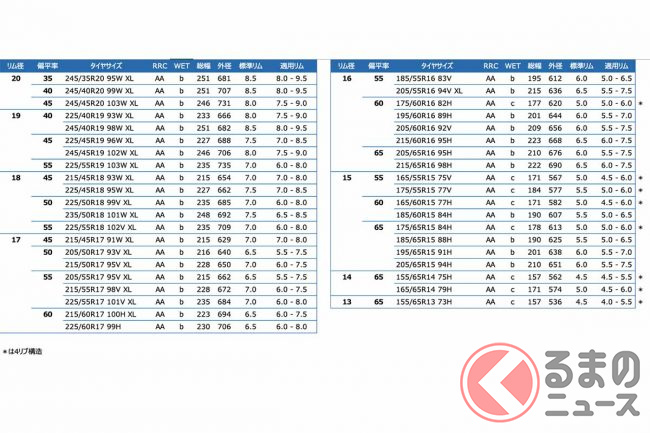 また、全40サイズでタイヤラベリング制度のRRC(転がり抵抗性能)は「AA」を獲得。ウエットグリップ性能は「b」もしくは「c」となるため、全サイズ低燃費タイヤとなっている。