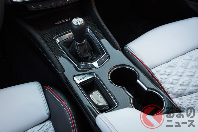 Vシリーズ・ブラックウイングは、最近のスポーツセダンとしては珍しく、6速MTを標準搭載。コンソールにあるトグルスイッチを押すと「アクティブレブマッチング」が作動、ダウンシフトに合わせて自動的にエンジン回転数を調整する。またノーリフトシフトにより、アクセルペダルを離すことなくシフトチェンジが可能だ。