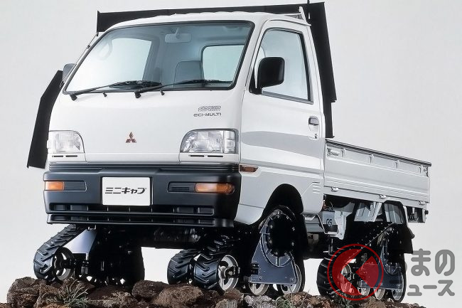ミニキャブトラック4クローラーは4WDのミニキャブトラックをベースにした特装車で、4輪のタイヤをクローラーに付け替えることが可能となっており、泥ねい地や砂地、深雪地帯など、過酷な路面状況での荷物の運搬に特化した商用車として開発。