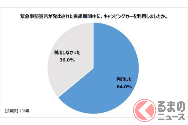 次に、緊急事態宣言が発出された自粛期間中にキャンピングカーを利用したかという質問には、自粛期間中にキャンピングカーを利用したと回答した人が全体の64%で、これまでキャンピングカーを利用したことのある人の比率と比べて、17.6ポイント低くなっていて、自粛期間中は利用を控える傾向がみられました。