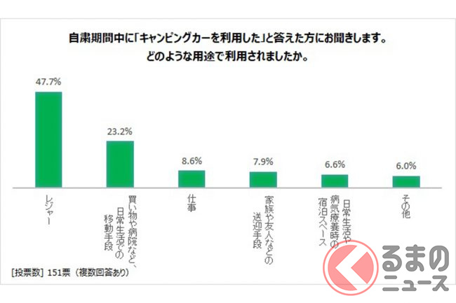 また、自粛期間中にキャンピングカーを利用した用途については、半数近い47.7%が、レジャーで利用したと回答しています。次に多かったのが、日常生活での移動手段で、キャンピングカーを日常使いする人も多く、クルマとしての機動性が発揮されたようです。