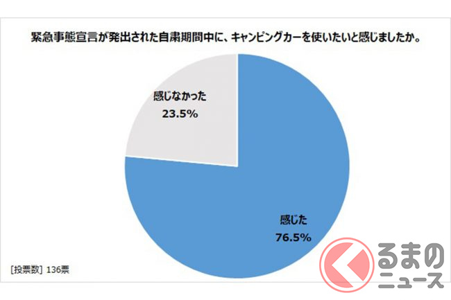 緊急事態宣言が発出された自粛期間中にキャンピングカーを利用したいと思ったかという質問に対しては、キャンピングカーを利用したかったと回答した人が多く、キャンピングカーの所有比率と同じ76.5%の人が、キャンピングカーを使いたかったと答えています。これらの回答から、使いたかったのに利用を控えた人が居たことが分かる結果となりました。