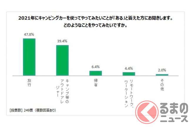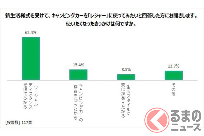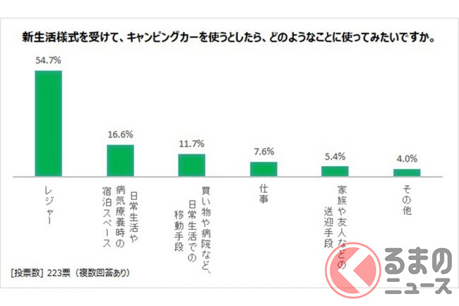 その他の自由回答では、ストレス発散やひとりでのんびりとするため、交通機関を使わない移動ができて、就寝も可能な場所としてや、テイクアウトをした時、お家でキャンプ気分を楽しむ、公共交通機関を使った旅行に代わる新たな生活スタイルの旅行などがあげられ、密を避けられ、公共交通機関を利用しないで移動できる点などに注目が集まりました。