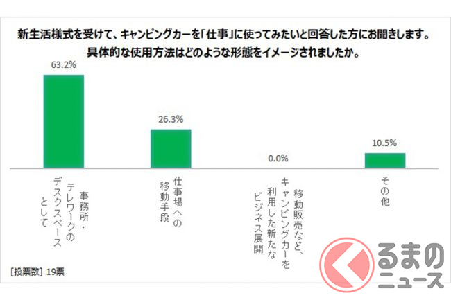 そこで、キャンピングカーを仕事で使ってみたい人に、期待する利用方法を聞いてみると、事務所・テレワークスペースとして利用してみたいという人が多く、全体の6割を占めています。ここでも、新生活様式で期待する利用方法と同様で、キャンピングカーのスペースとしての有効性に焦点があてられているようです。