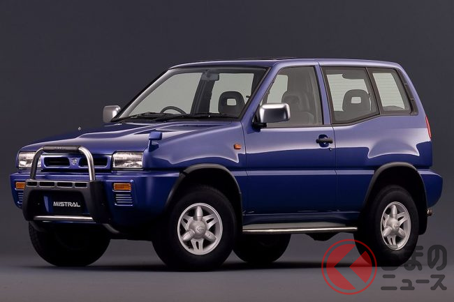 RVブームでクロカン車のヒットが続くなか日産は車種の拡充を図り、ミストラルはテラノと同じく9代目ダットサントラックのラダーフレームを流用することで開発。当初はロングボディ3列シートの4ドアのみの設定でしたが、後に2ドアのショートボディを追加しています。