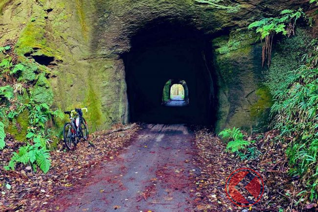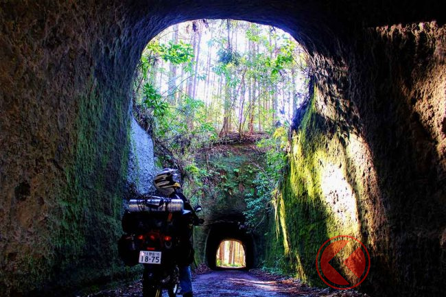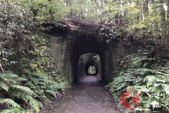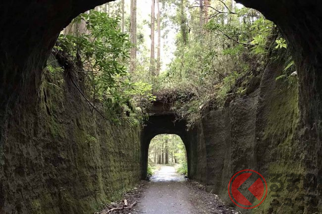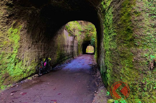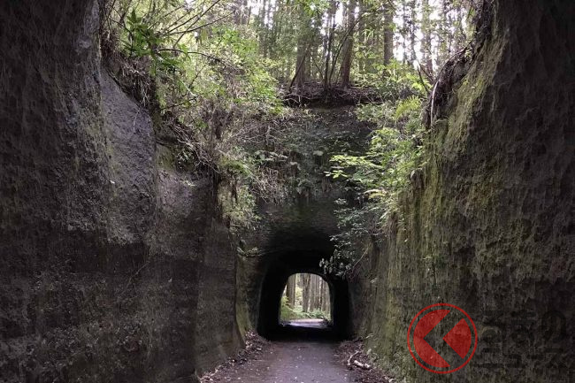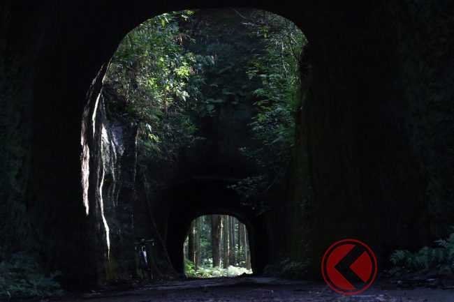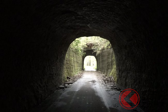 ちなみに月崎トンネルは、ふたつのトンネルが連続して並んでおり、その間には天井がないため、空が見えるようになっているのですが、これはもともと1本のトンネルだったものが、天井が崩れてふたつになったといわれています。