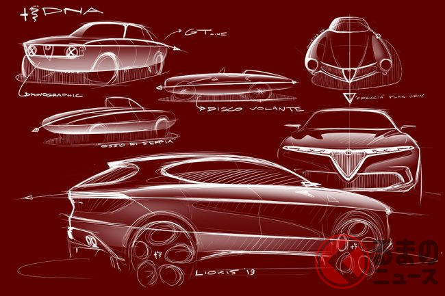 ・Exploration(探求の道):第二次世界大戦後に登場した「6C2500」の豪華仕様モデルから採用された「トリロボ」または「トレフォイル フェイス」と呼ばれるフロントマスクから受け継がれる楯型グリルが、PHEVクロスオーバーであるトナーレにも受け継がれていることを解説し、さらにアルファ ロメオによる未来のモビリティの姿が示唆されている。