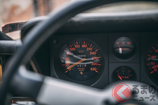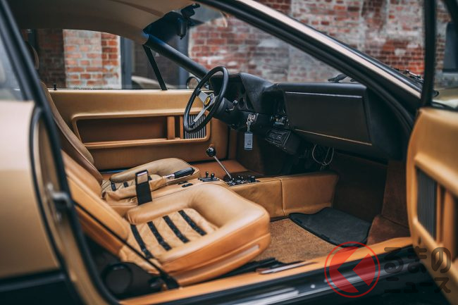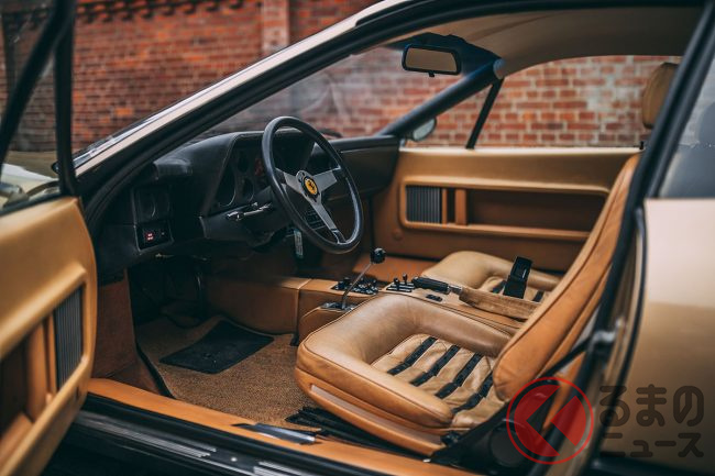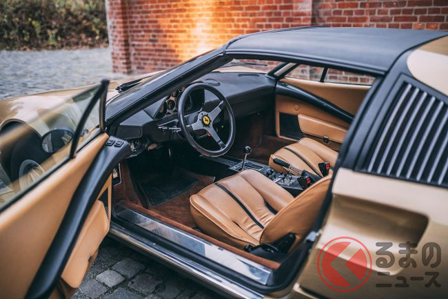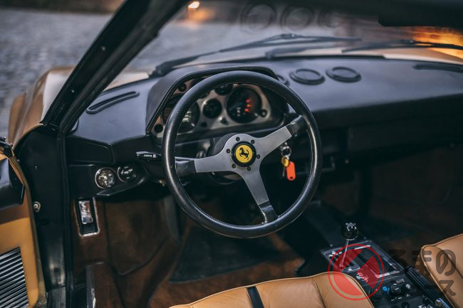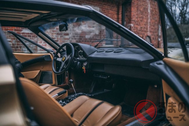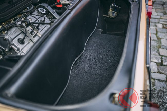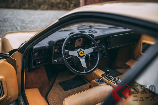 この時代、フェラーリといえば、やはりレッドが定番のボディカラーで、ほとんどのカスタマーは迷わずにレッドを選択したようだ。オロキアロメタリック(ゴールド)のエクステリアカラーにペレベージュ(ベージュ)のインテリアで仕上げられたモデルは極めて希少だ。
