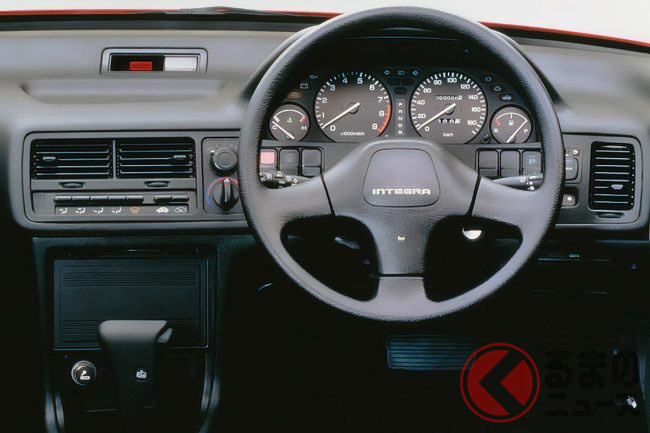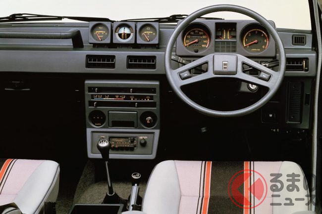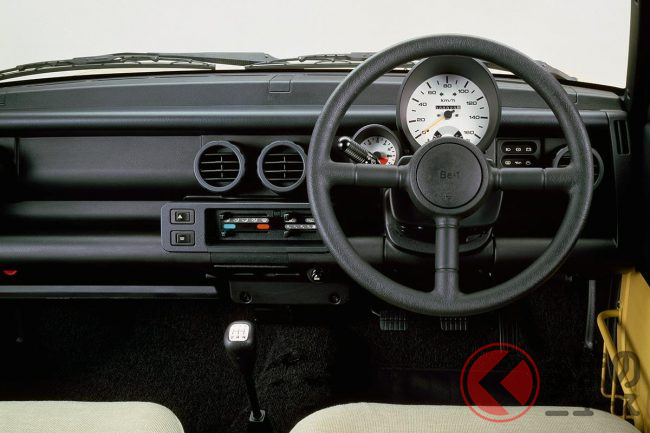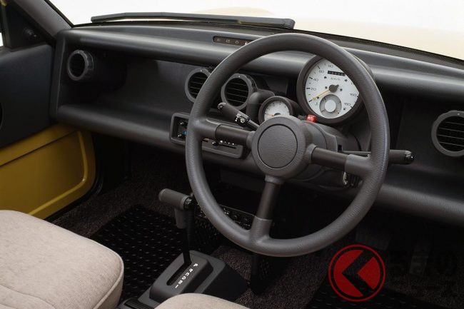 内装も極めてシンプルながら安っぽい印象は無く、トレー状のインパネにはドライバーの正面に大型のスピードメーターを配置し、左に小ぶりなタコメーター、さらに空調の吹出口もすべて丸にすることで、ポップな印象となっています。
