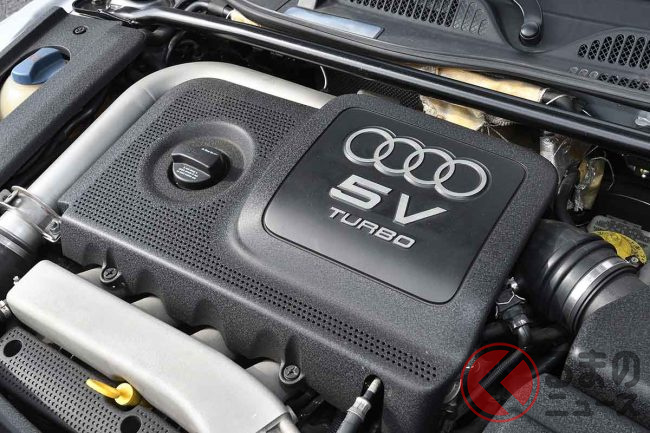 ボンネットを開けると、エンジンルームにびっしり臓物が詰まっていて、カバーのアウディのエンブレムと「5V TURBO」の文字が誇らしげだ。後方排気レイアウトで、鋳物のインテークマニホールドが前方にあり、いまどきのエンジンとはだいぶ様相が異なる。