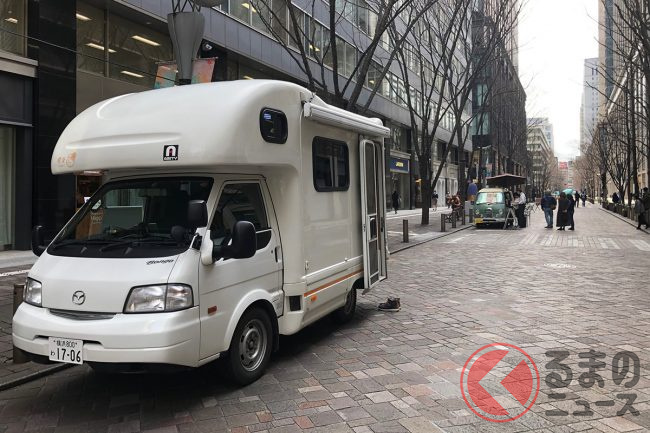 そのうちの2台はキッチンカーで、テイクアウトのランチメニューや、コーヒーやデザートを提供しているのですが、もう1台はちょっと場違いな感じでビルの前に止まっている、マツダ「ボンゴ」をベースとしたキャンピングカーです。