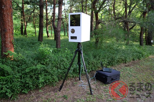 設置してある森のなかは、とてもクルマが通れる道幅は存在しません。この白い箱のなかには、確かにカメラが入っています。写真を見るとパソコンにもつながっています。