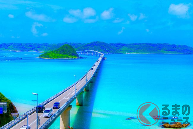 エメラルドグリーンの海の上をクルマや自転車などで走る迫力は爽快で、映画「四日間の奇蹟」のロケ地になるなど、映画やCMなどで度々起用されている人気スポットです。