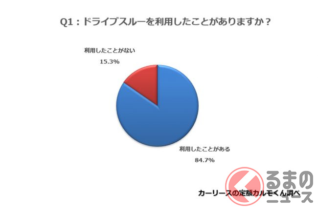 まず、普段クルマを運転する全国の男女1381人に、ドライブスルーを利用したことがあるかどうかを聞いたところ、「利用したことがある」と回答したのが1170人、「利用したことがない」と回答したのが211人で、80%を超える多くの人がドライブスルーを利用したことがあるという結果となりました。