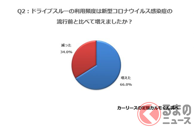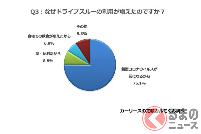 ドライブスルーの利用頻度は新型コロナウイルス感染症の流行前と比べて増えましたか? という質問には、66%が「増えた」、34%が「減った」と回答。利用頻度が増えた人に理由を聞いてみると、75.1%の人が「新型コロナウイルスが気になるから」と回答しています。