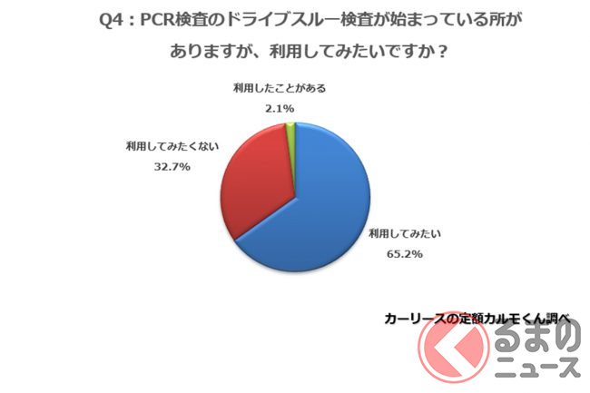 最後に、ドライブスルーを利用したことがあると回答した1170人に、ドライブスルーでのPCR検査を受けてみたいかどうかを聞いたところ、「利用してみたい」という回答が65.2%、「利用したことがある」という回答が2.1%となっており、ドライブスルーでのPCR検査について前向きな考えを示している人も多くなっている一方で、30%以上の人は「利用してみたくない」と回答しています。