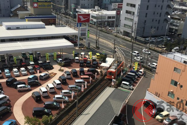 なぜダイハツ販売店に路面電車の駅が存在? 摩訶不思議な光景の正体とは