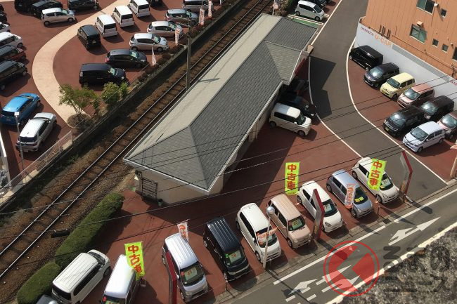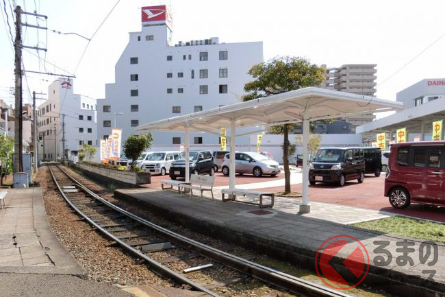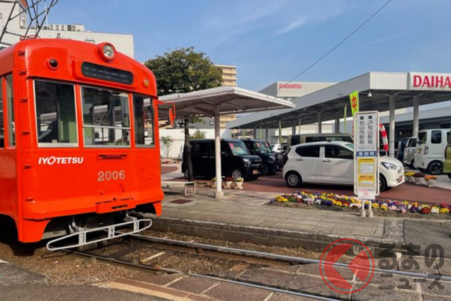 愛媛県松山市のダイハツ販売店の敷地内には路面電車の駅が存在するといいます。なぜ、自動車を販売する場所に駅が存在するのでしょうか。