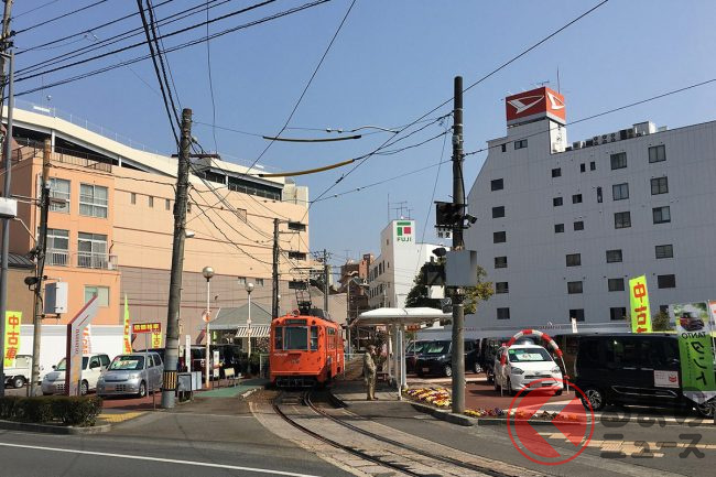 愛媛ダイハツ販売松山店の北側敷地を北東から南西にかけて、100m弱の距離を斜めに突っ切っているのは、伊予鉄道大手町線(環状線)の路面電車で、敷地部分には「宮田町駅」という停留所も存在します。