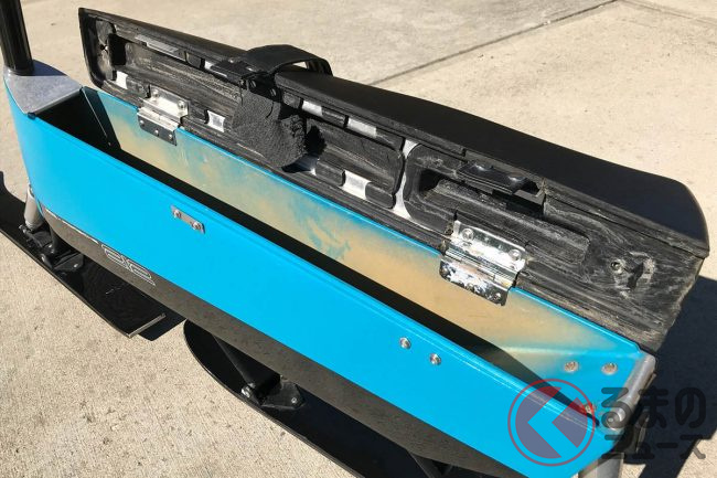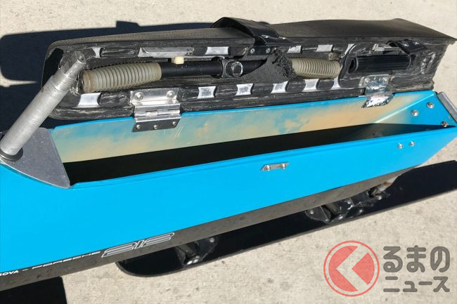 フロントとリアのスキーにはショックアブソーバーが組み合わされ、またその前後スキー、ハンドルバー、ステアリングシャフト、そして乗り手が履く一対のショートスキーを、美しくボディの内部に格納できるように設計されていたのである。