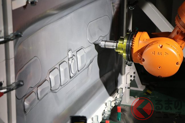 対向式ダイレス成形とはボディパネルの少量生産に対応する技術として2019年10月に発表され、棒状の工具を取りつけたロボットがパネルを徐々に変形させて成形するというものです。