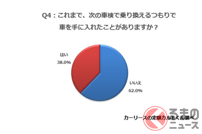さらに調査対象となった全1385人に、「次の車検で乗り換えるつもりでクルマを手に入れたことがあるか」を聞いたところ、「いいえ」と回答した人が62%だった一方で、「はい」と回答した人も38%おり、一定数の人は「初めから次の車検時での乗り換えを検討」してクルマを取得しているということがわかりました。