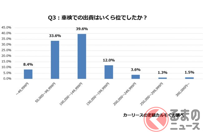 続いて、最初の質問で車検をとおしたことがあると回答した1285人に、「車検での出費はいくらくらいだった」かを聞いたところ、「10万円から14万9999円」がもっとも多い39.6%、次に「5万円から9万9999円」が33.6%という結果になりました。