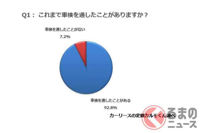 自家用車を持つ全国の男女1385人に対し、これまで車検をとおしたことがあるかどうかを聞いたところ、92.8%となる1285人が「車検をとおしたことがある」と回答。7.2%の100人が「車検をとおしたことがない」と回答する結果となりました。