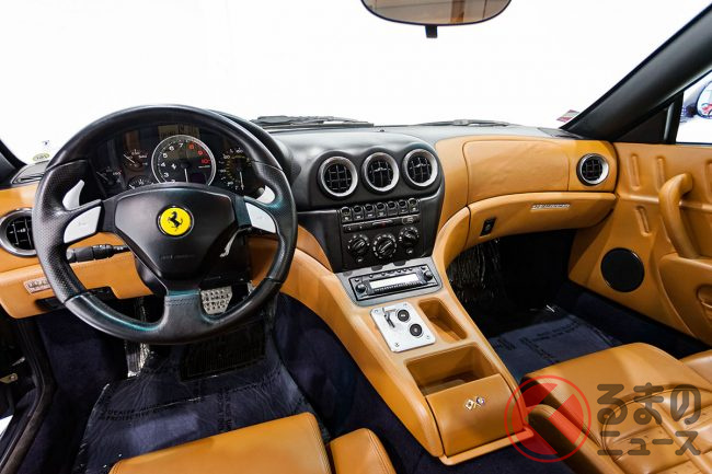 今回のオークションに出品された575Mマラネロは、2003年6月に生産された「F1」仕様だ。ダークブルーのボディに「クオイオ(ナチュラルレザー色)」にカラースキームが選択されている。