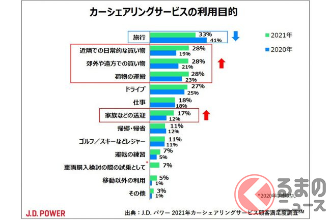一方で「近隣での日常的な買い物」や「郊外や遠方での買い物」、「荷物の運搬」、「家族などの送迎」といった日常使いでの利用割合は増加しています。