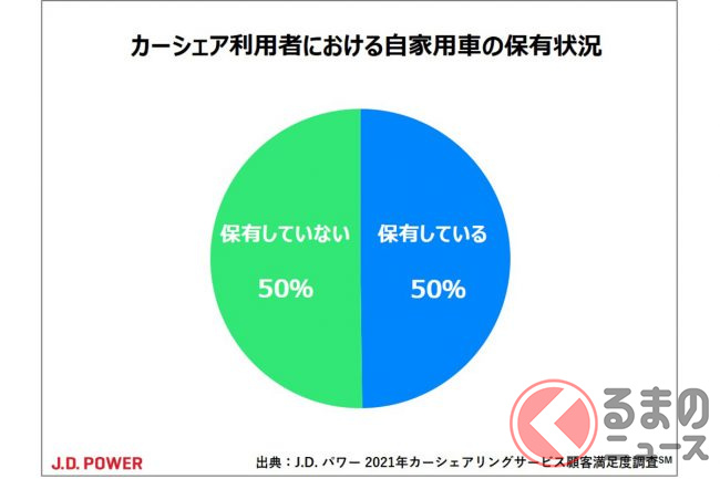 次に、カーシェアリングサービス利用者における自家用車の保有状況を見てみると、半数が自家用車を保有しているユーザー、半数がマイカーを保有していないユーザーに二分される結果となりました。